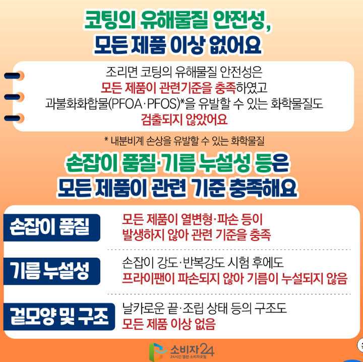 유해물질 안전성과 과불화화합물 유발 가능한 화학물질도 검출되지 않았습니다. 손잡이 품질과 기름누설성 등도 모든 제품이 기준을 충족하였으니, 가격과 사이즈, 인덕션인지 여부 등을 확인하여 나에게 맞는 후라이팬을 찾으면 되겠습니다.