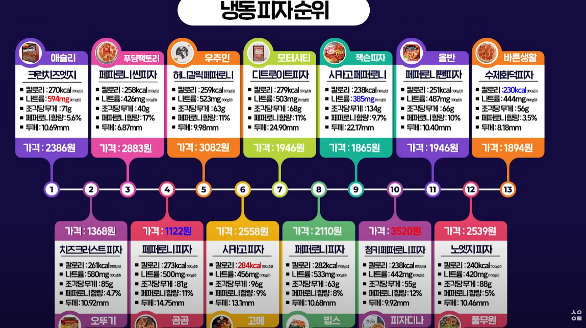 마찬가지로 냉동피자(페페로니 위주) 13종을 꺼내 주어진 조리시간만큼 조리한 후 블라인드 테스트를 하며 점수를 매겨 평균을 내는 방식입니다. 다만 기존의 블라인드 테스트보다는 모양이 조금 더 천차만별인지라 완전히 블라인드 테스트하기는 어려울 것 같습니다. 모양만 봐도 알만한 피자들이 상당히 있으니까요 ㅎㅎ