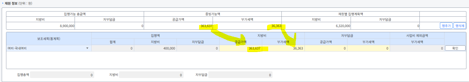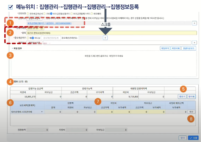 (6)~(7) 보조세목을 선택하고 사용한 금액을 지방비와 자부담금으로 나누어 입력합니다.