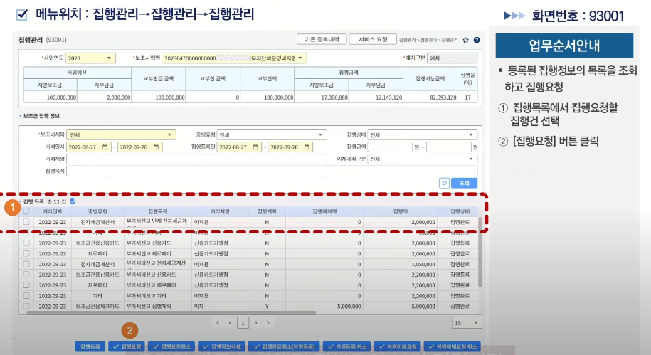(1) 집행목록을 확인하여 체크박스 선택 후