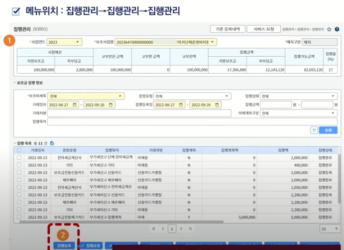 메뉴는 집행관리 > 집행관리 > 집행관리로(93001) 들어옵니다.