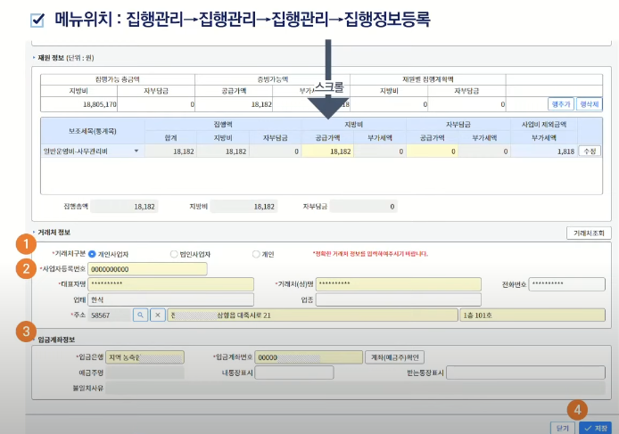 하단의 집행등록을 진행합니다.