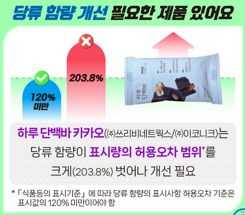 영양성분은 차이가 있었는데요. 하루 단백바 카카오 제품은 당류 함량이 허용오차 범위를 벗어나 개선이 필요했습니다.