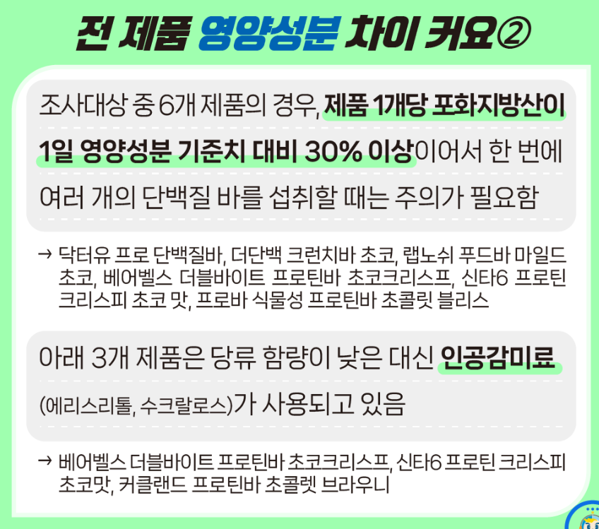 그리고 그 중 6개 제품 (닥터유, 더단백 크런치바, 랩노쉬 푸드바, 베어벨스 프로틴바, 신타 6 프로틴바 등)은 포화지방산이 30% 이상인지라 여러 개를 한 번에 드시는 것은 지양하는 편이 좋을 것 같습니다.