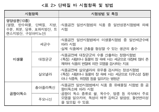 단백질바는 영양성분, 미생물 수, 곰팡이독소 등이 있는지를 체크했습니다.