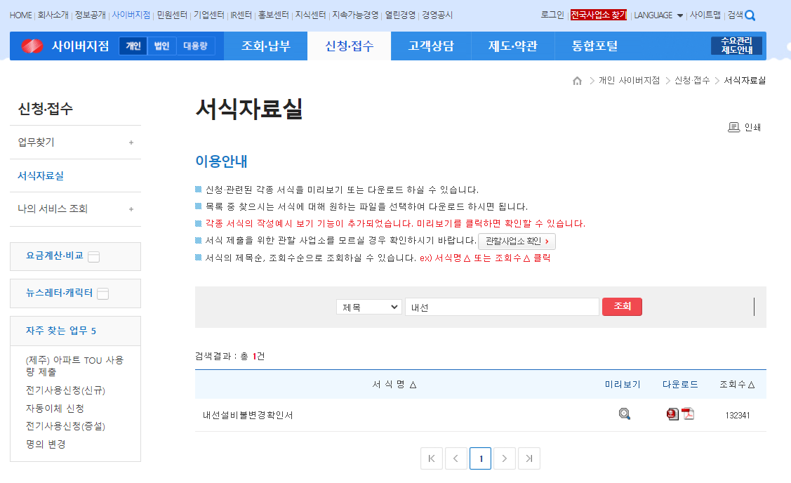 내선설비불변경신청서 다운로드 방법