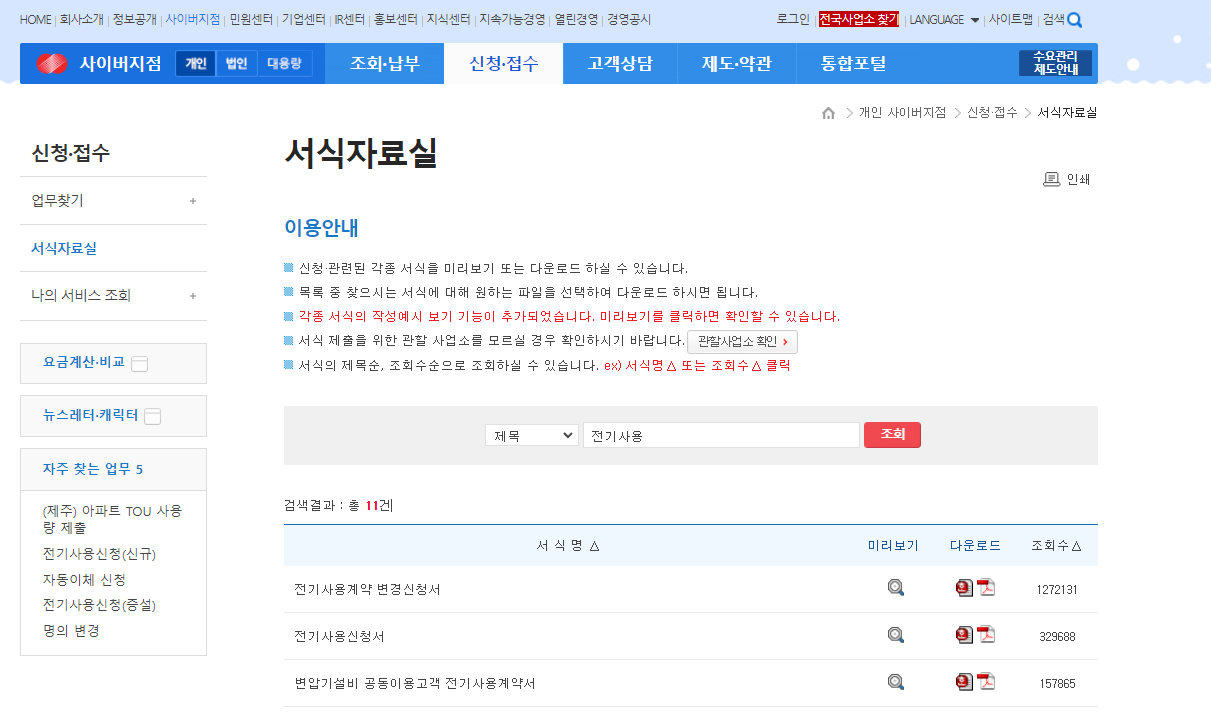 전기사용계약변경신청서 다운로드 방법