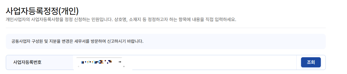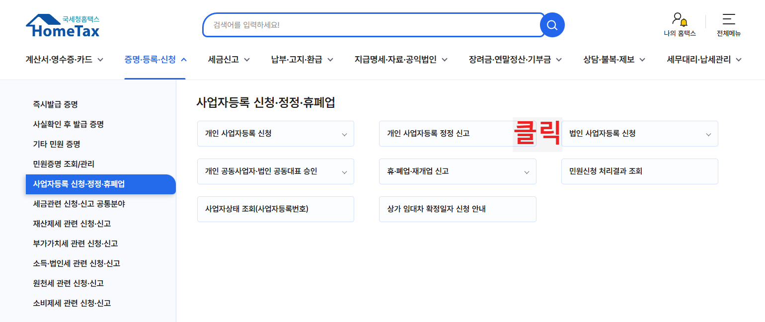 증명/등록/신청 - 사업자등록 신청 - 사업자등록 정정신고를 클릭합니다.