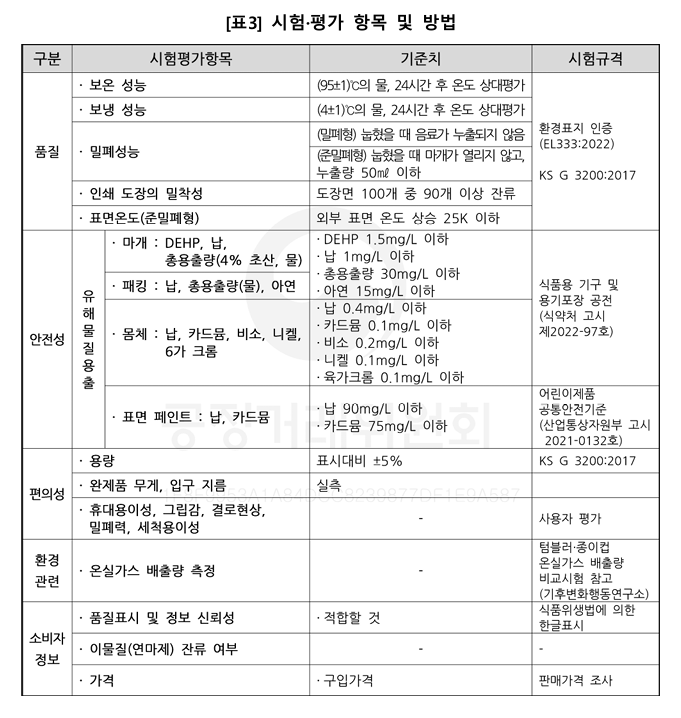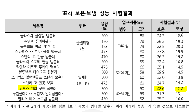 보온은 95도의 물을 넣고 마개를 닫은 후 실온에서 24시간이 지난 후의 물 온도를 측정하였으며, 보냉은 4도의 물을 넣고 보온과 동일하게 측정하였습니다.
