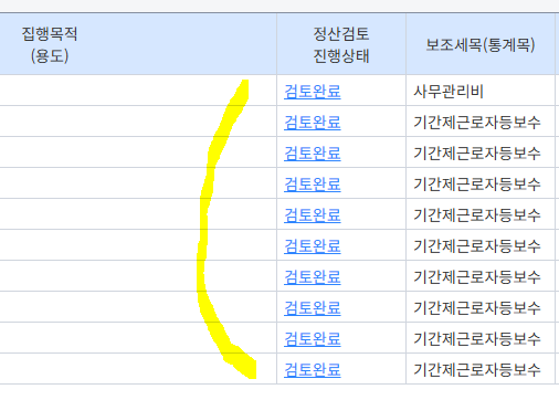 하단 집행 내역 중 정산검토진행상태가 검토완료가