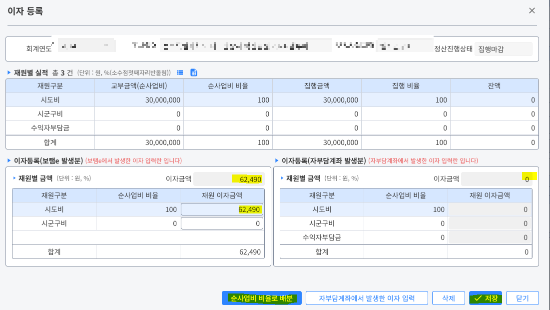 통장을 확인하여 이자금액을 넣어주시면 되는데, 이자금액을 넣고 사업비 비율대로 이자금액 배분 버튼을 클릭하시면 내용을 채우실 수 있습니다.