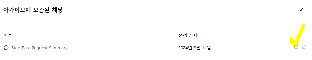 아카이브는 대화를 삭제하지 않고 임시보관하는 기능으로, 중요 정보를 보관하는데 유용한 기능인데요, 다시 접근해서 복원 가능하다는 것이 핵심입니다. 잠시동안만 좌측 탭에서 삭제하는 셈이죠.