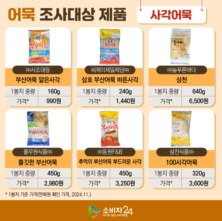 1번 부산어묵 얇은 사각이 가격이 가장 저렴하고,