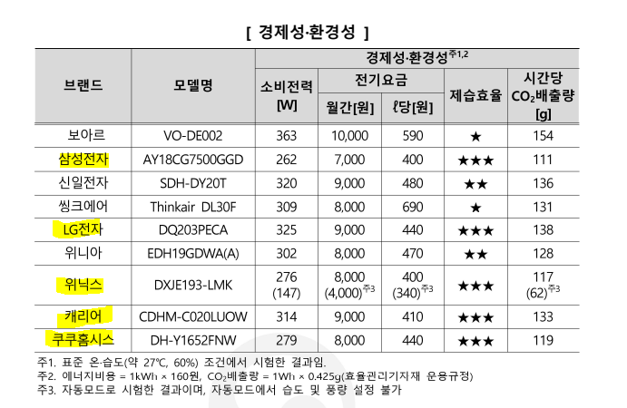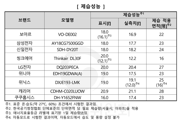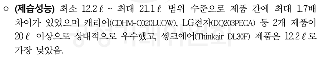 제습성능은 캐리어와 LG 전자 제품이 상대적으로 가장 우수했습니다.