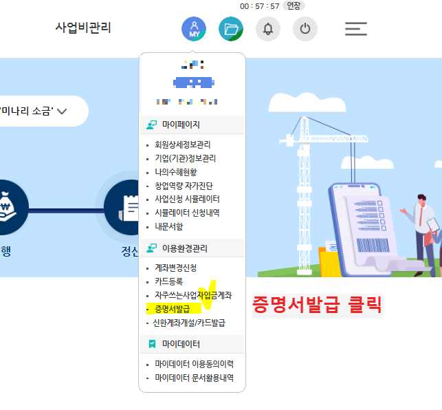 우상단의 MY를 클릭하면 하단에서 4번째에 증명서 발급