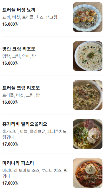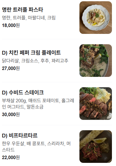 메뉴입니다. 저는 명란트러플 파스타 / 수비드스테이크 / 홍가리비 토마토파스타(?)를 시킨 것 같습니다.