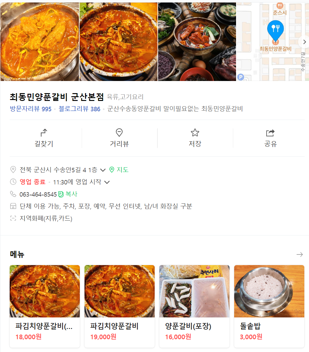 최동민 양푼갈비 군산 본점 메뉴판