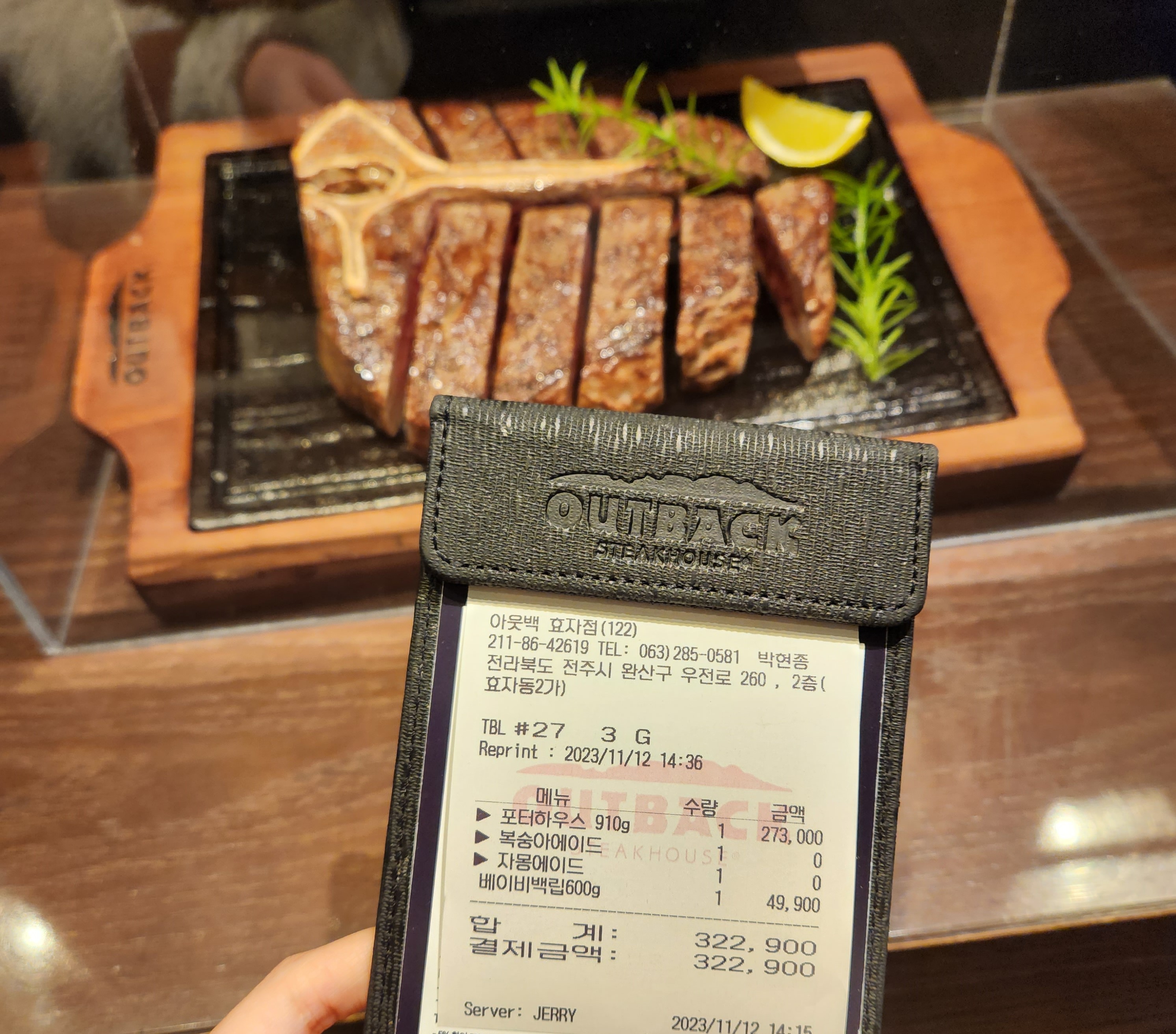 포터하우스 스테이크 세트(투움바+에이드) + 베이비백립 = 322,900원이 청구되었습니다.