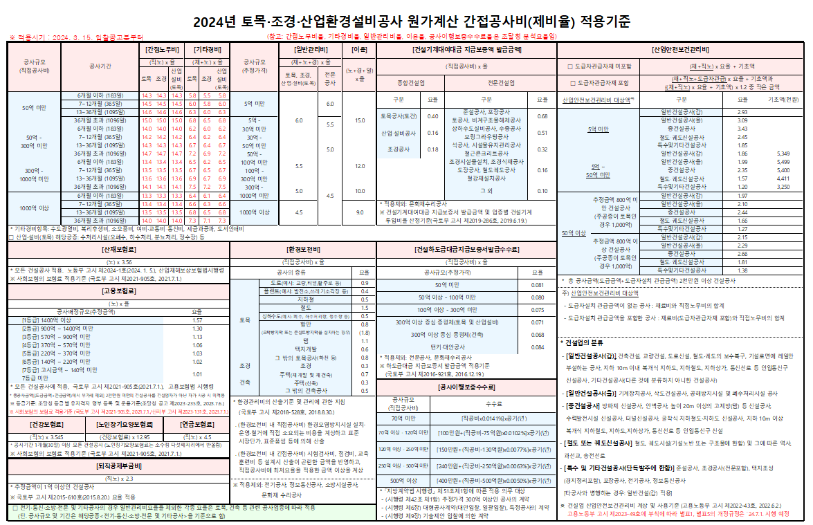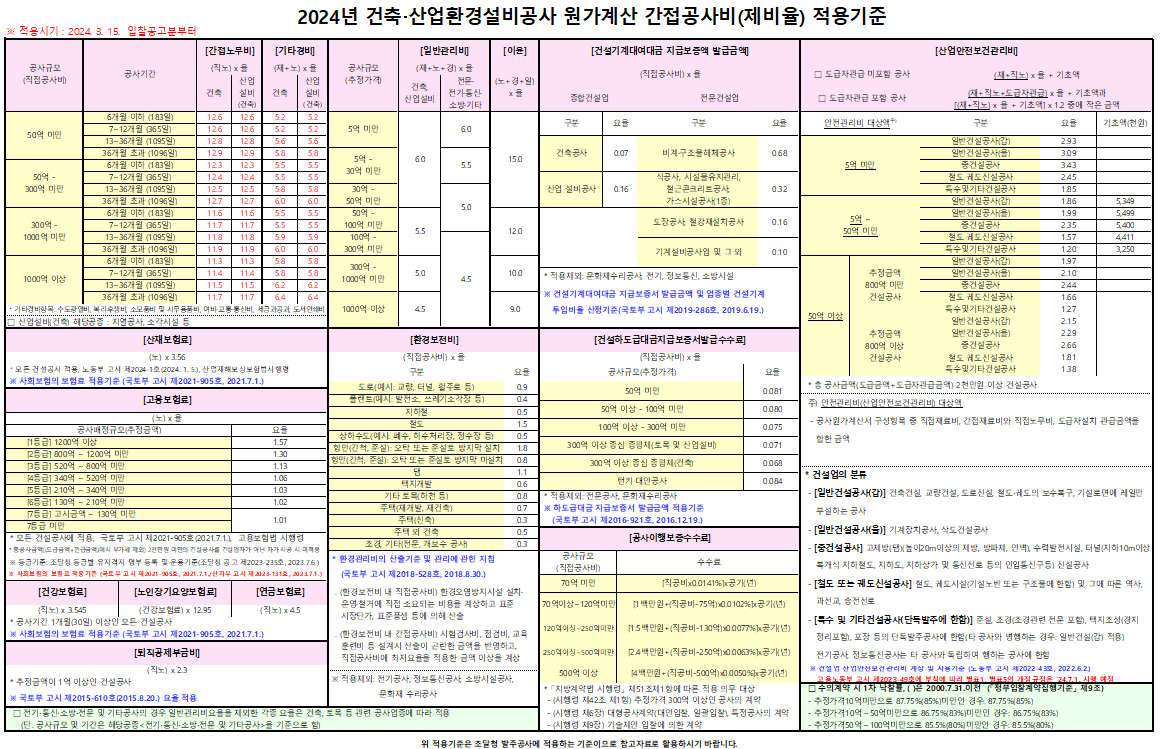 (24. 3. 15.) 2024년 제비율표 조달청 시설공사 원가계산 간접공사비 적용기준